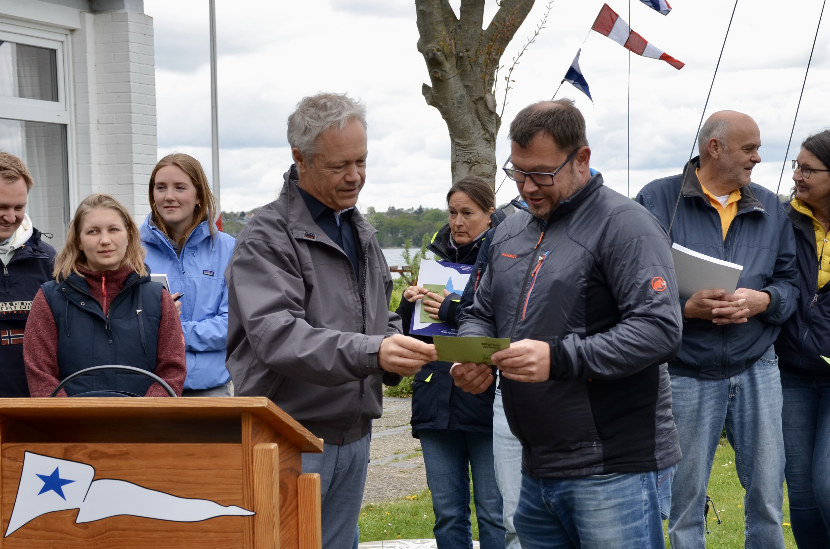 Der stv. Kommandeur der Marineschule, Herr Kapitän zur See Jens Martin nahm den großen Stander der SVF im Empfang, um mit der POSEIDON das Flaggschiff, also das "richtungsweisende" Führungsschiff der Schiffsflotte zum Ansegeln zu sein.