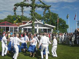Schon mittags beginnen Kinder und Mütter beim gegenüberliegenden Campingplatz Kränze und Haarschmuck für die festliche Zeremonie zu basteln und sich zu schmücken. Um 15 Uhr geht es dann los. Mit musikalischer Begleitung führen zunächst die Kleinen in ausgelassener Stimmung Freudentänze um die Midsommarnatstång auf. Im Anschluss sind die Senioren in ihren bunten Trachten mit den einstudierten Tänzen dran. Wir werden von der guten Stimmung angesteckt und freuen uns, zusammen mit der HALMARE-Crew, über den liebevoll geschmückten Baum und eine endlos lange Tafel im Segelclub. Bei Gegrilltem, Wein und Bier erleben wir eine schöne Midsommarnat in großer geselliger Runde.