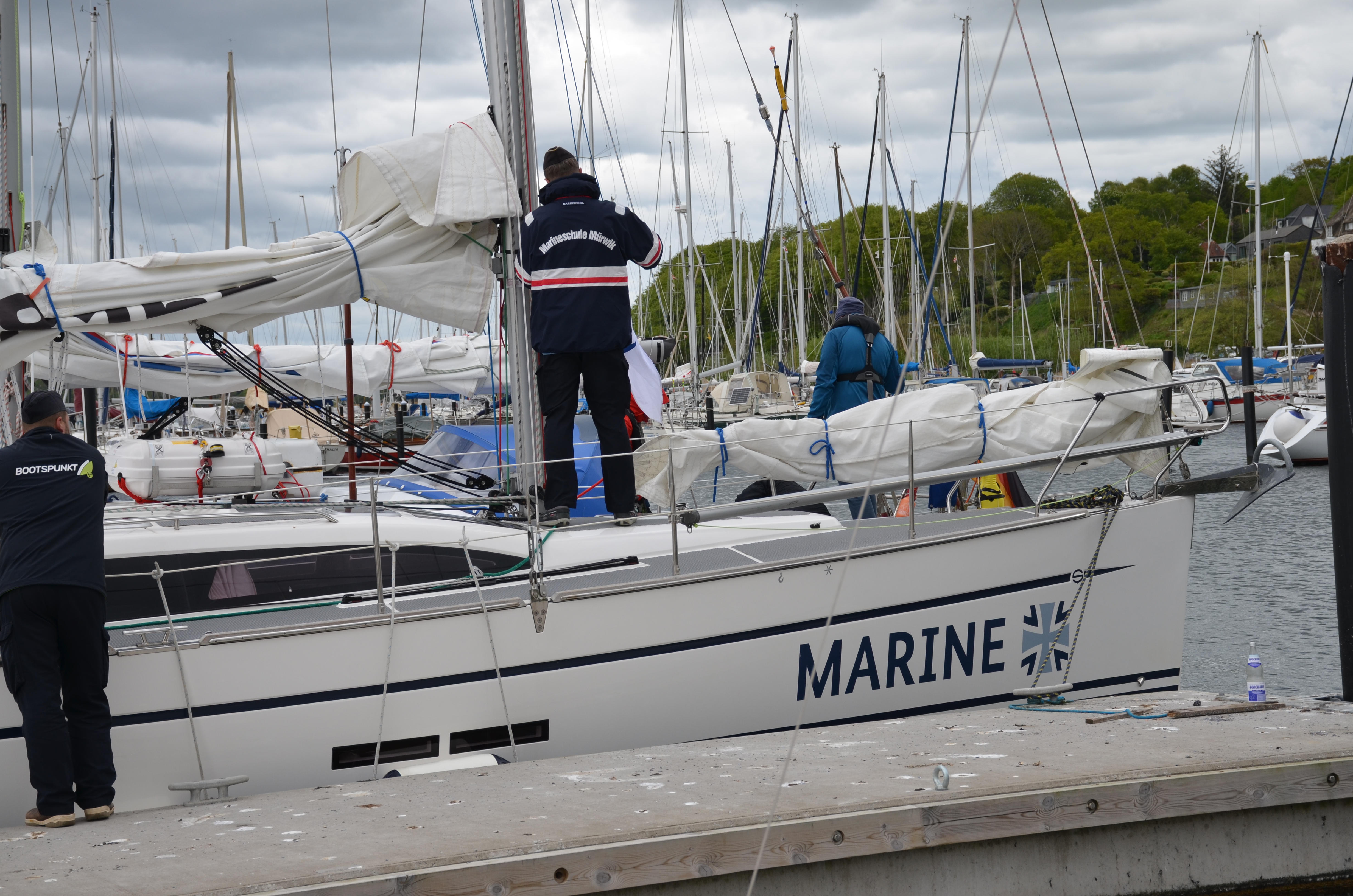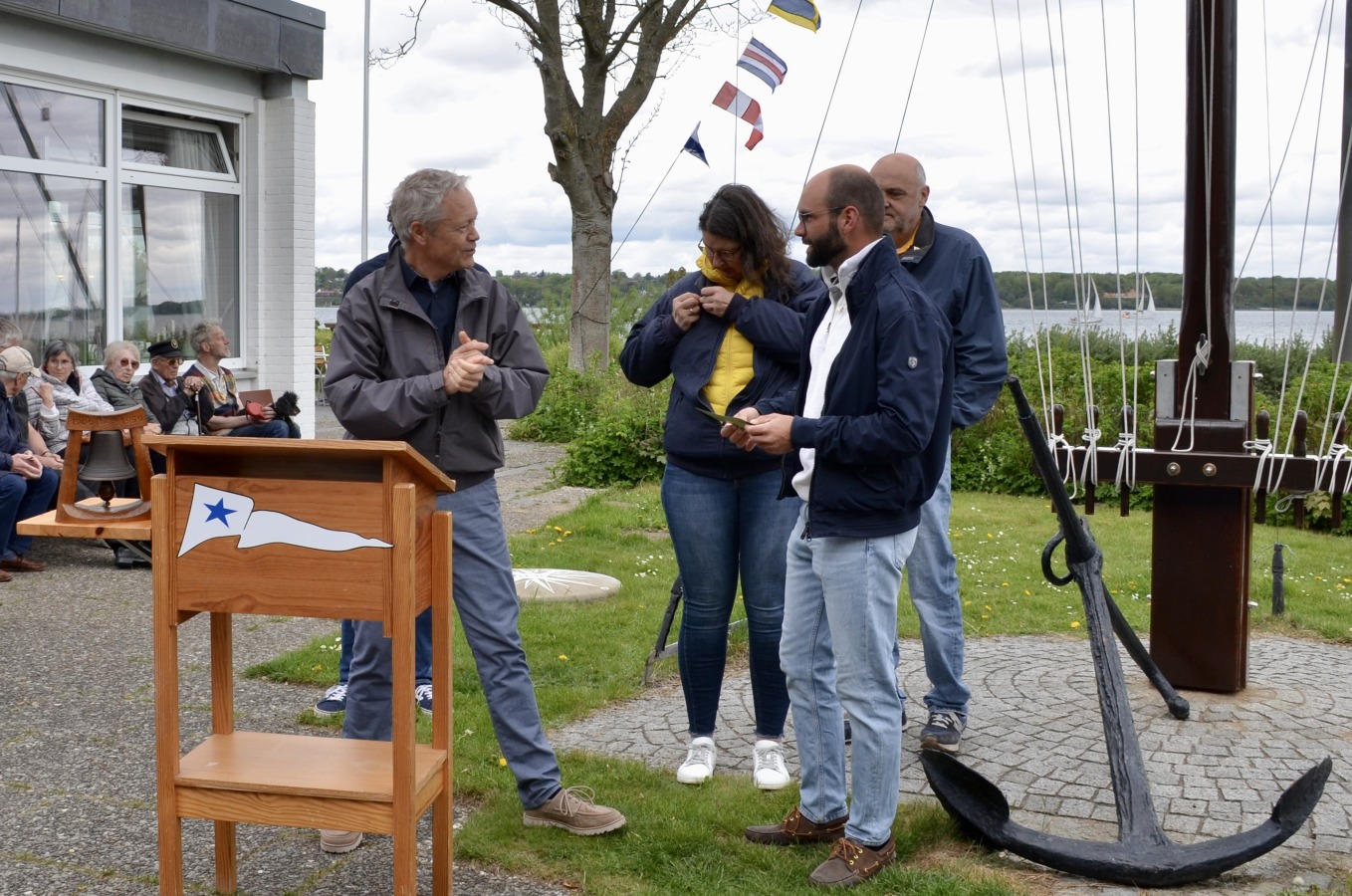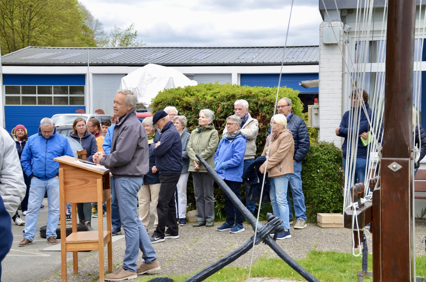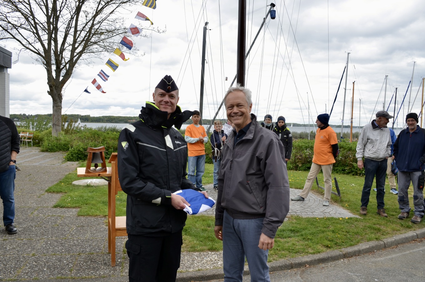 Der stv. Kommandeur der Marineschule, Herr Kapitän zur See Jens Martin nahm den großen Stander der SVF im Empfang, um mit der POSEIDON das Flaggschiff, also das "richtungsweisende" Führungsschiff der Schiffsflotte zum Ansegeln zu sein.