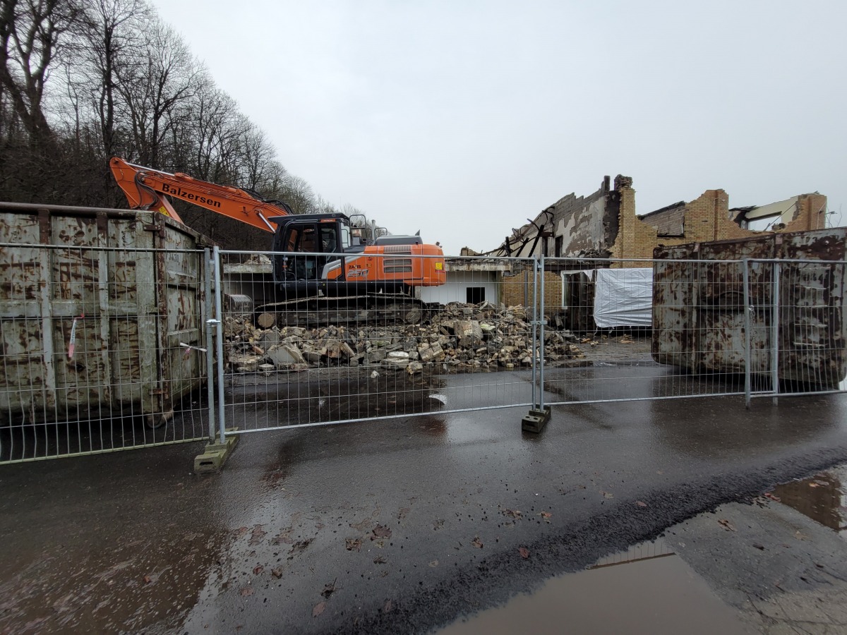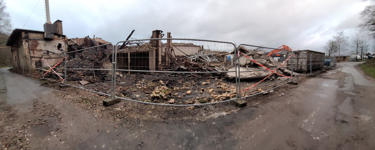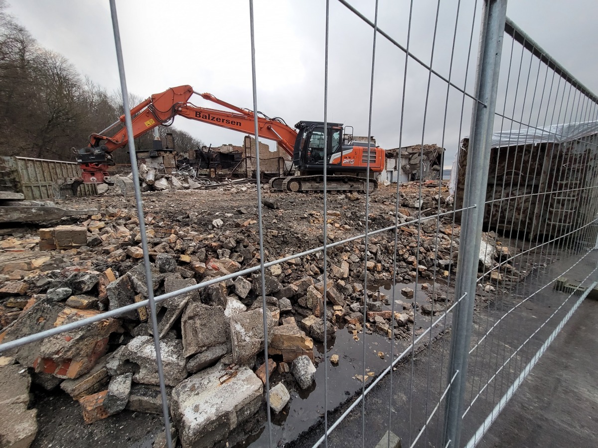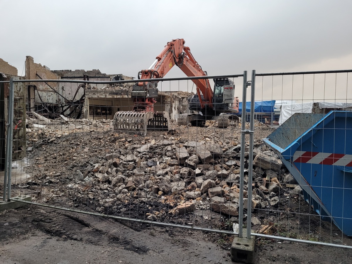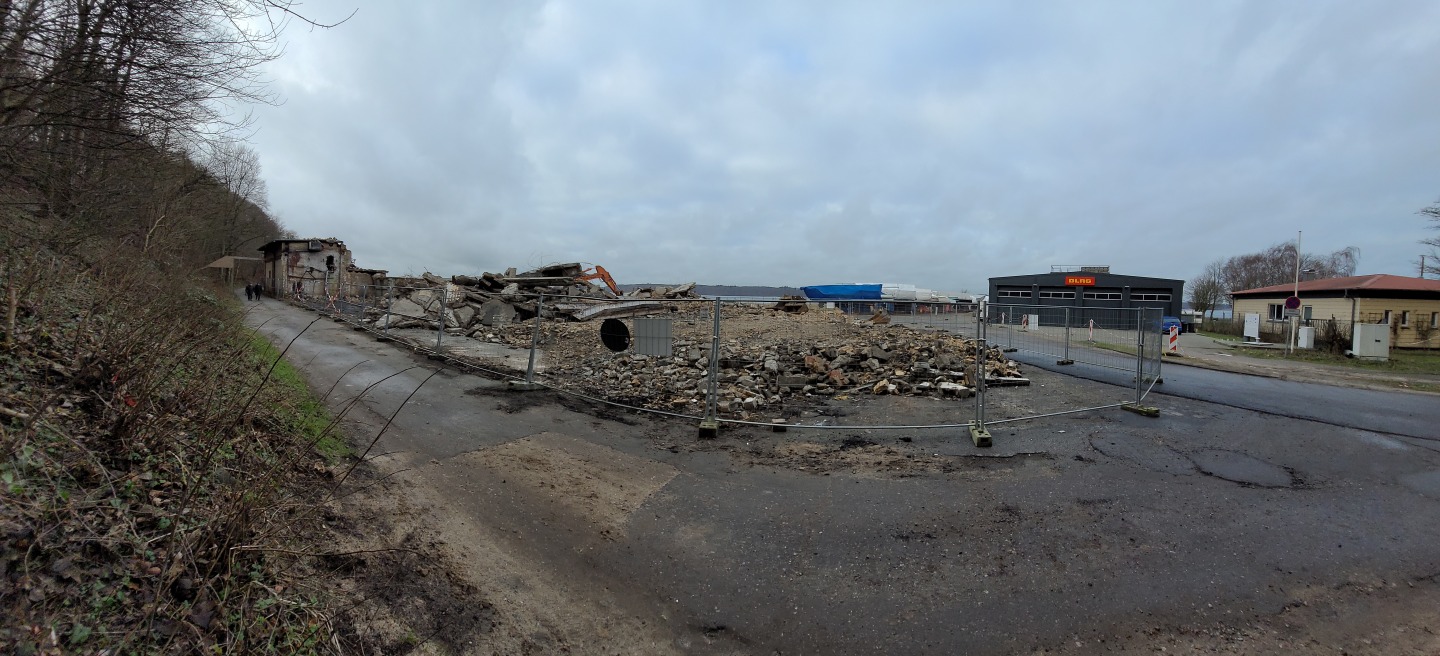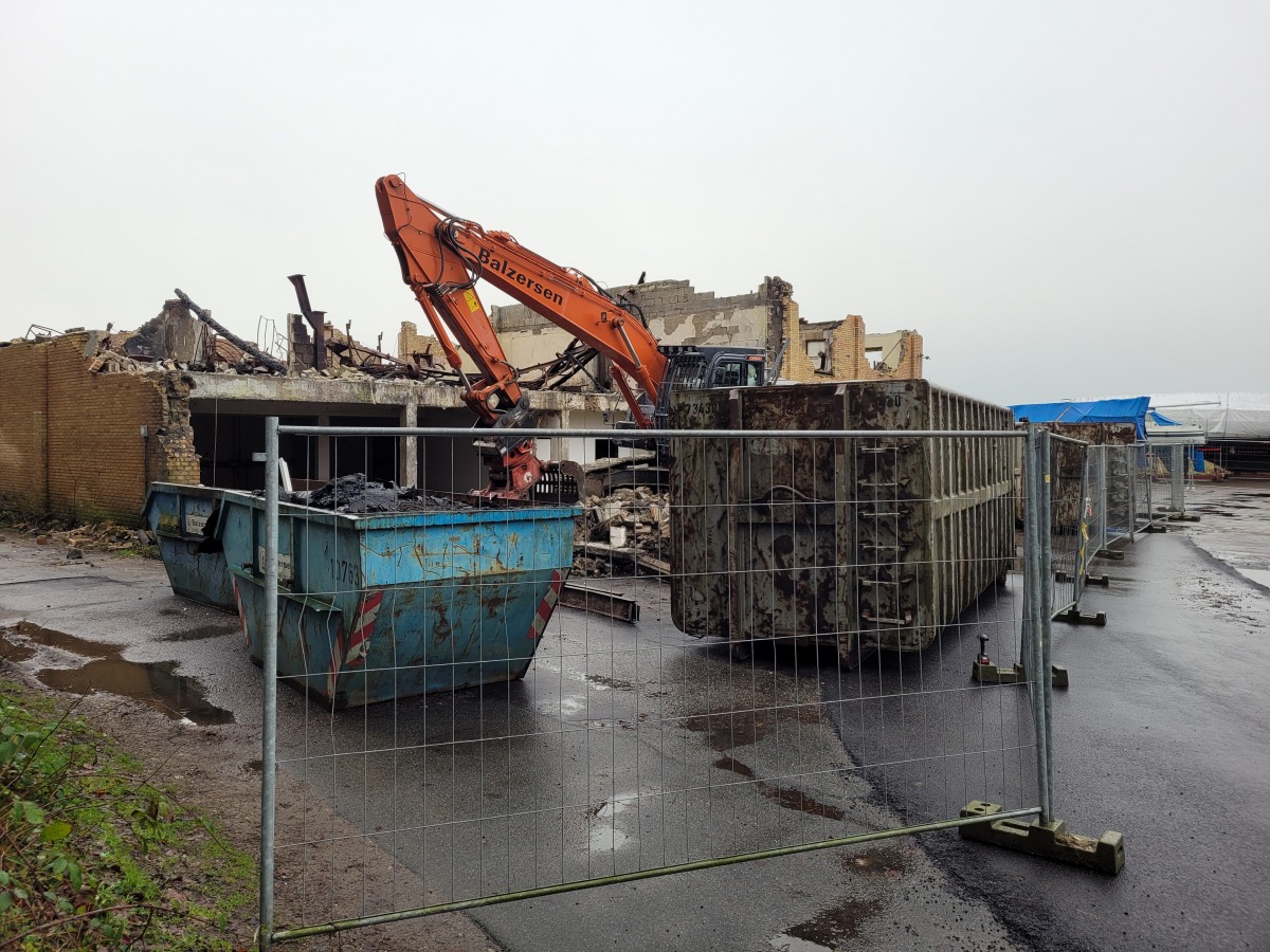 Abriss der alten Flugzeughalle auf Fahrensodde 20 nach dem Brand im Frühjahr 2021.